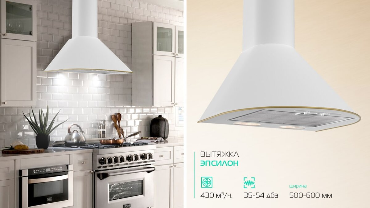 При выборе важно учитывать ширину плиты: вытяжка должна быть не уже варочной поверхности, а лучше — немного шире. Например, элегантная настенная модель "Эпсилон" выпускается в пяти цветах (нержавеющая сталь, чёрный, белый, топленое молоко и медный антик) и имеет две версии — с шириной 50 или 60 см. Она поддерживает два режима работы — отвод воздуха через вентиляцию или рециркуляцию. Производительность — 430 м³/ч, уровень шума — 35-54 дБ.